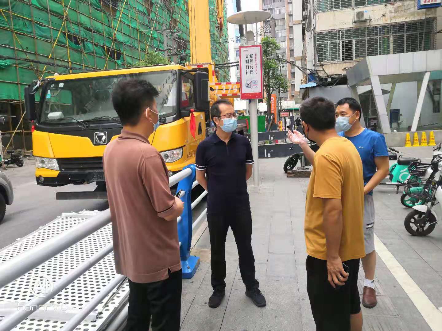 首先在中商外立面改造施工現(xiàn)場,聽取中鴻裝飾公司的施工進(jìn)度工作匯報后,陳施俊同志要求,在圍繞按期完成施工任務(wù)的同時,要加強員工疫情防控知識宣傳教育,提高員工個人防護(hù)意識,督促員工做好健康監(jiān)測。對施工場地、辦公場所、員工集中住宿區(qū)和食堂等重點場所要開展常態(tài)性衛(wèi)生大掃除和消殺。